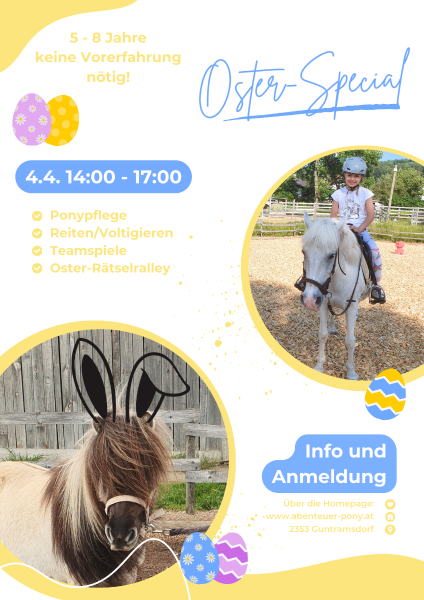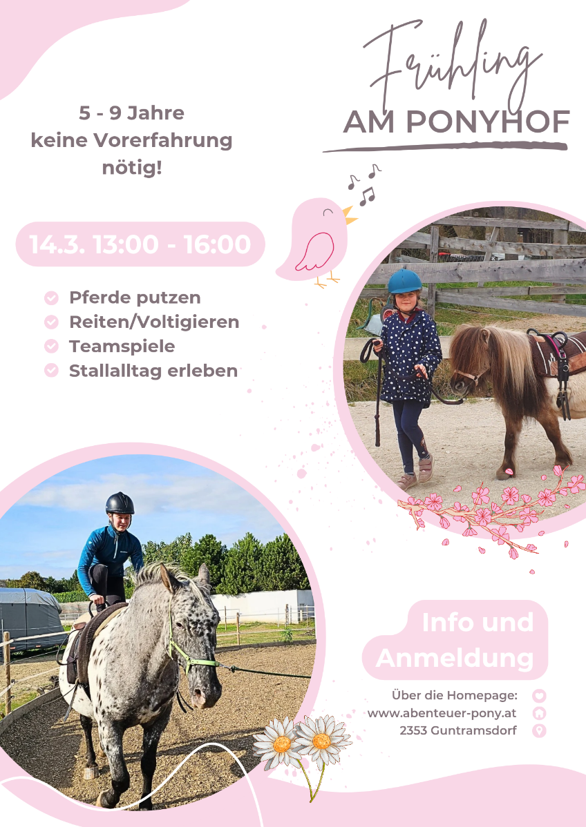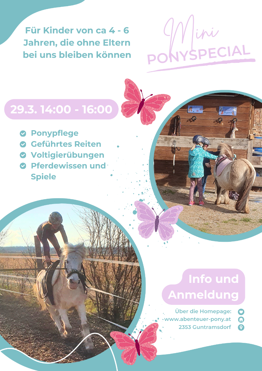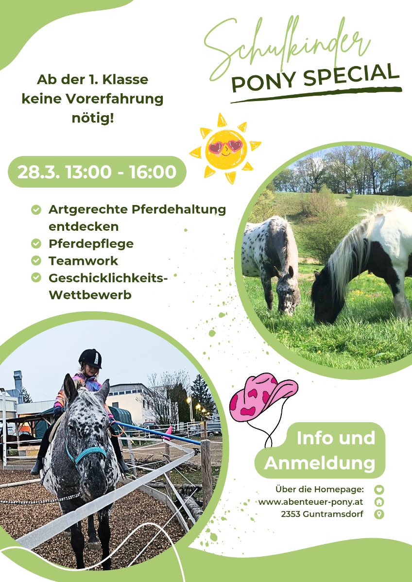 Zusätzlich zu den fortlaufenden Gruppen bieten wir ab und zu auch weitere Termine, wie zB Workshops, Reiterspiele oder Stalltage, an. Oft auch ohne Vorerfahrung, zum Reinschnuppern oder einfach für die Extrapotion Ponyglück!